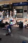 The “Insects” was a mob re-visited, one that Mal dreamed up a couple of years ago. We liked it so much, we thought deserved another run. A short, sweet and quirky idea, that caused some observers minor alarm, as 50 mobbers started to cough and twitch, and fall to the ground. Alarm turned rather quickly to amusement and confuddlment. You have to love that in a flashmob! A security guard was over heard saying “Any idea what the %#@ that was?” His friend, stroking beard said.. ”I really don’t know. Maybe it was one of them flashmob things?”
