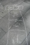 By 2:25pm you will have made your way to the Town Hall steps. The Mob rep, wearing the Rastafarian hat, will be in the vicinity. At 2:30pm the rep will move to the sidewalk. This is your cue to also move onto the sidewalk,, within their general vicinity. The rep will take off their hat. This is your cue to have your chalk ready. The rep will crouch down, and pull out their chalk, and begin to draw their hopscotch grid. Pick a spot close by, but with enough room for you to draw a grid too, and draw yours.