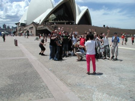 "On your mark" by drawing attention to themselves, talking about the view, whilst bumbling for a camera. They will ask a passer-by to take their photo. As the reps take their time, issuing instructions on how to use the camera and pose, jump into the photo, and bellow CHEEEEEEEEEEEESE! (A long drawn out eeee is required). Throw your arms out wide, and smile. Wait for a startled look, and hopefully a pic, then mock disperse. Head towards the Opera house. On a day like today there should be lots of easy targets.
