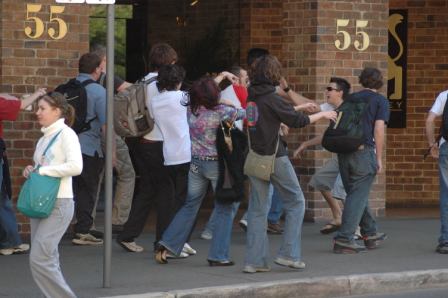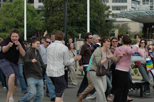 So who the hell ARE are flashmobbers? Just about anyone with a bit of joie de vie. We are Students and Grandparents, professionals and professional idiots. We range in age from three to sixty three. We come from as far as Bathurst, Katoomba and Newcastle to participate in a three minute event. We are, probably, all very silly people at heart. Our mantra , Congregate. Act. Disperse. The words that bring us joy? Overhearing someone say "What the HELL Was THAT?!?"