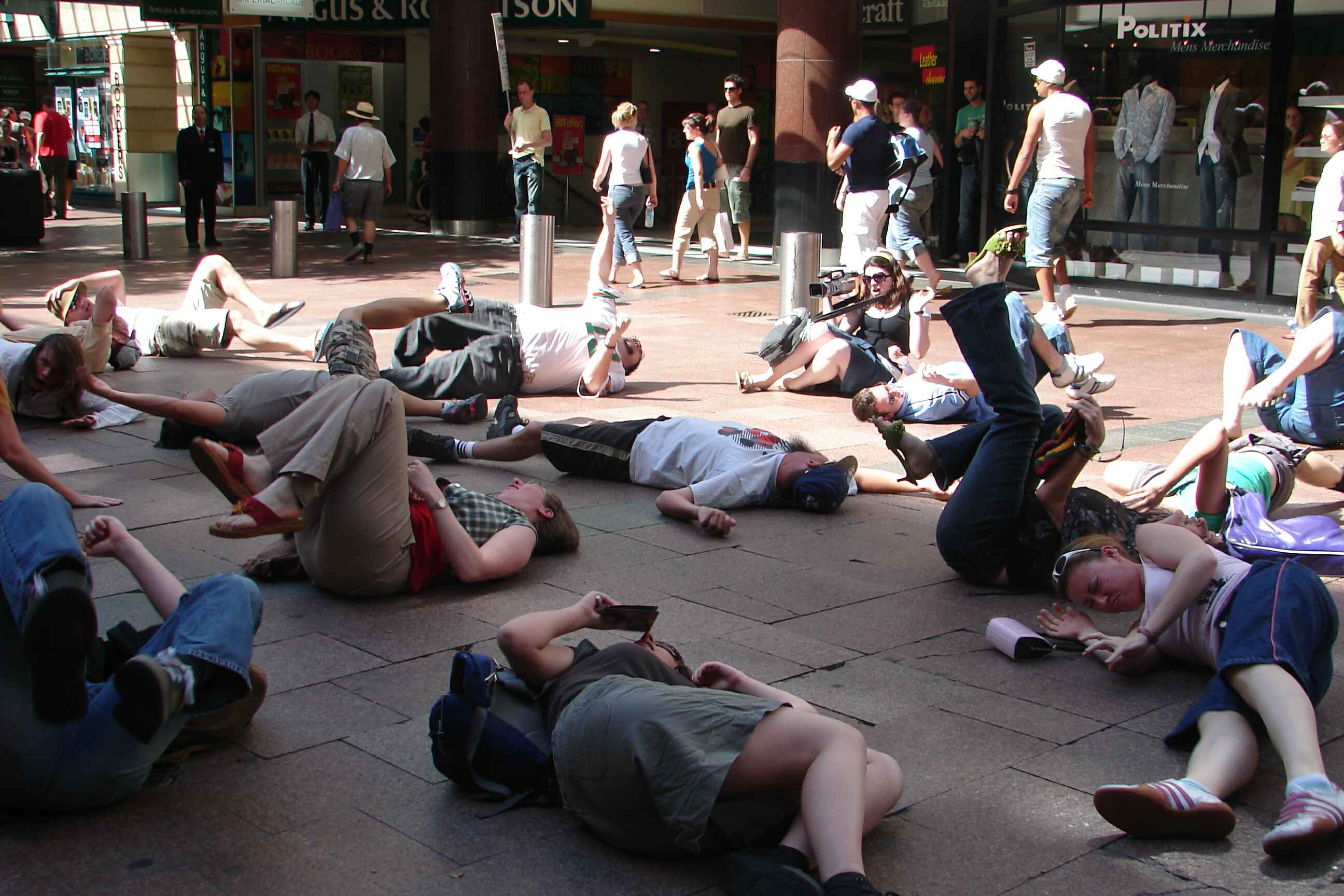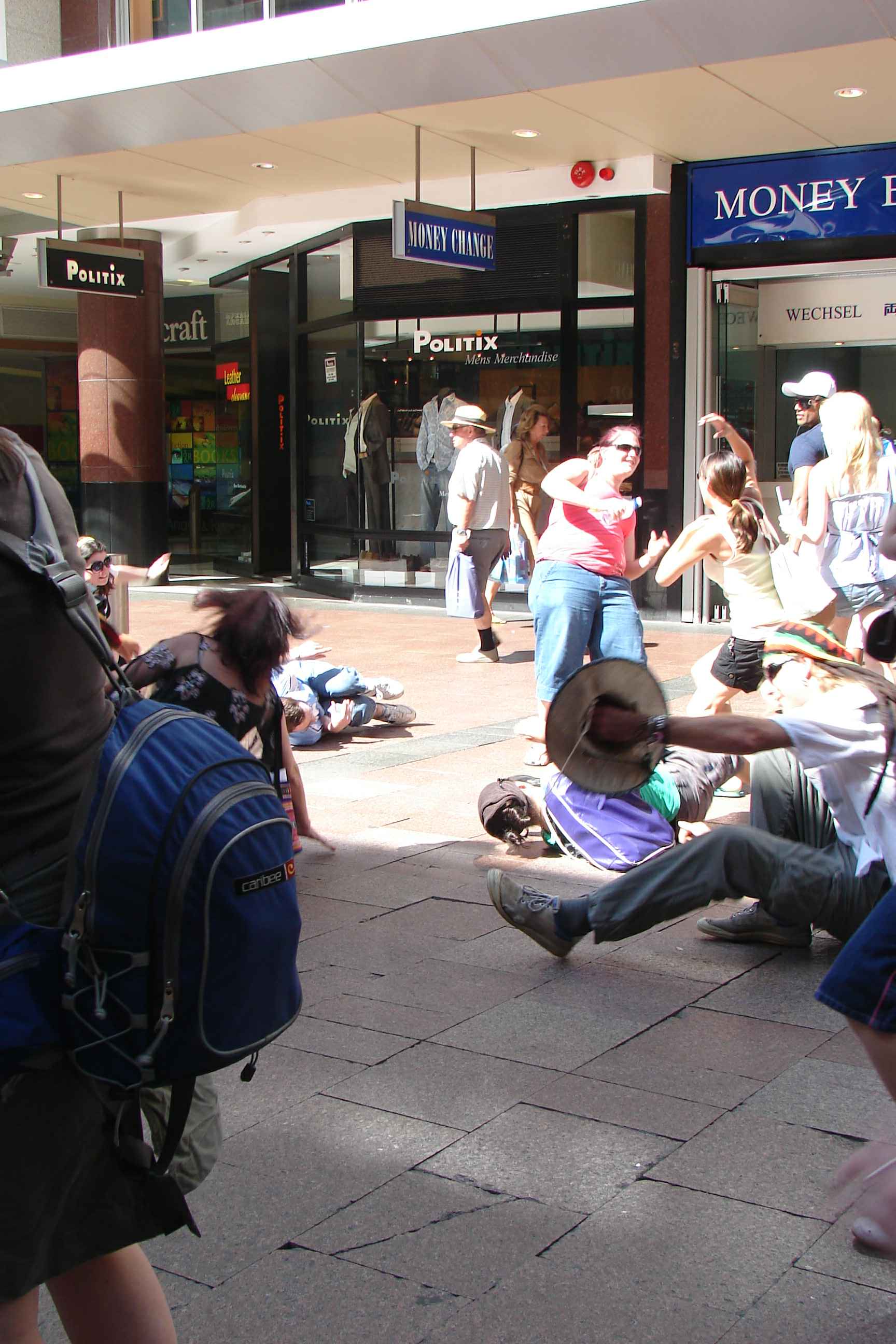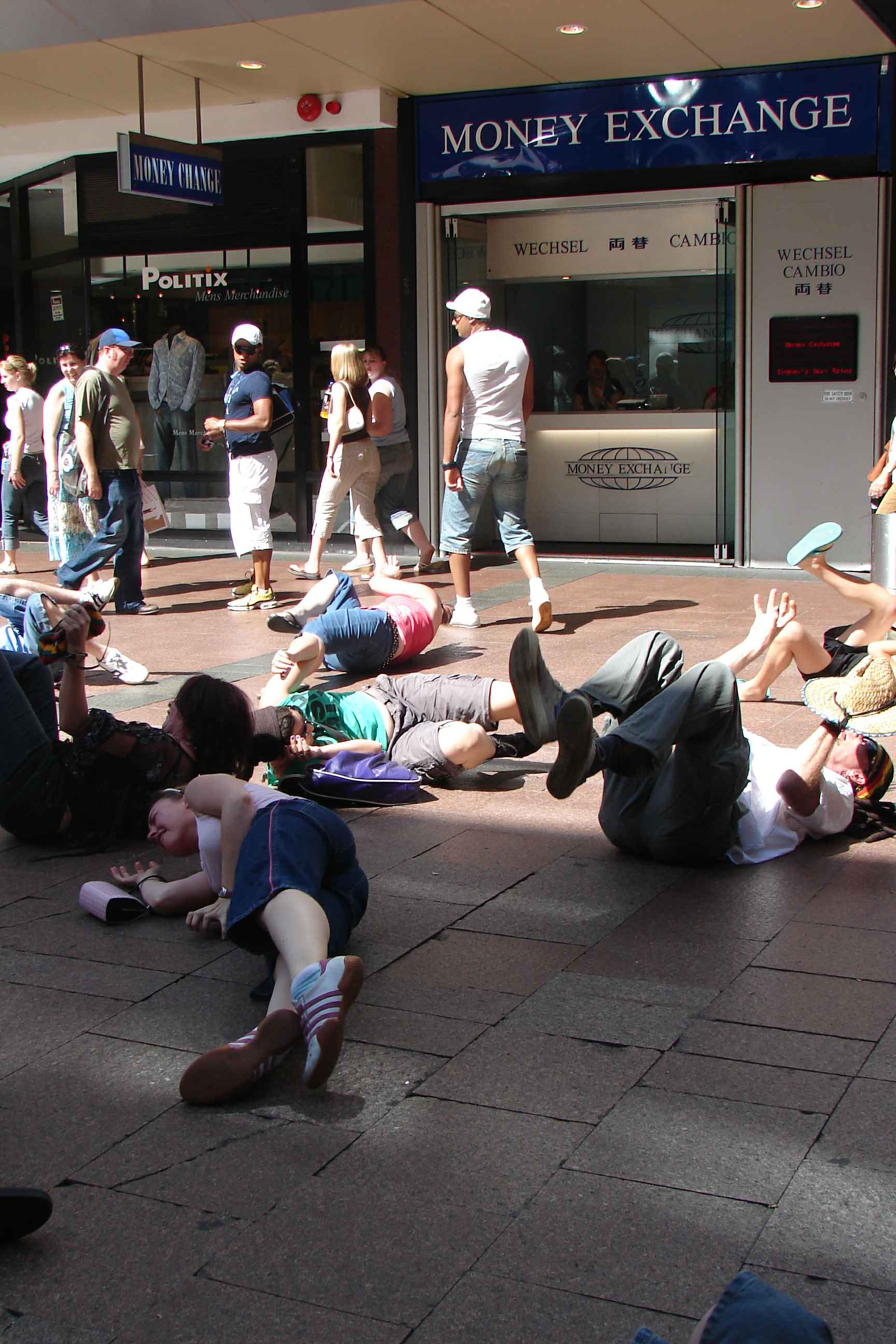 The “Insects” was a mob re-visited, one that Mal dreamed up a couple of years ago. We liked it so much, we thought deserved another run. A short, sweet and quirky idea, that caused some observers minor alarm, as 50 mobbers started to cough and twitch, and fall to the ground. Alarm turned rather quickly to amusement and confuddlment. You have to love that in a flashmob! A security guard was over heard saying “Any idea what the %#@ that was?” His friend, stroking beard said.. ”I really don’t know. Maybe it was one of them flashmob things?”