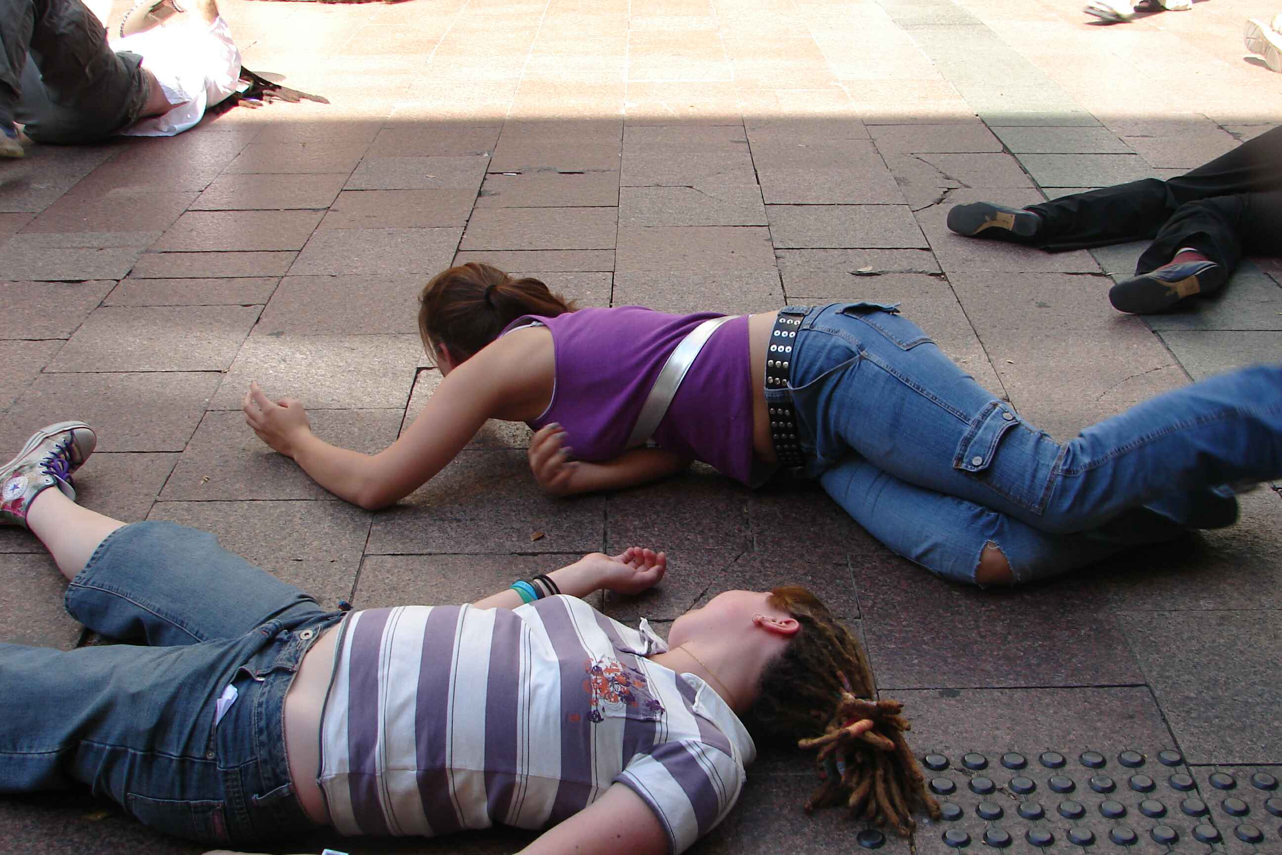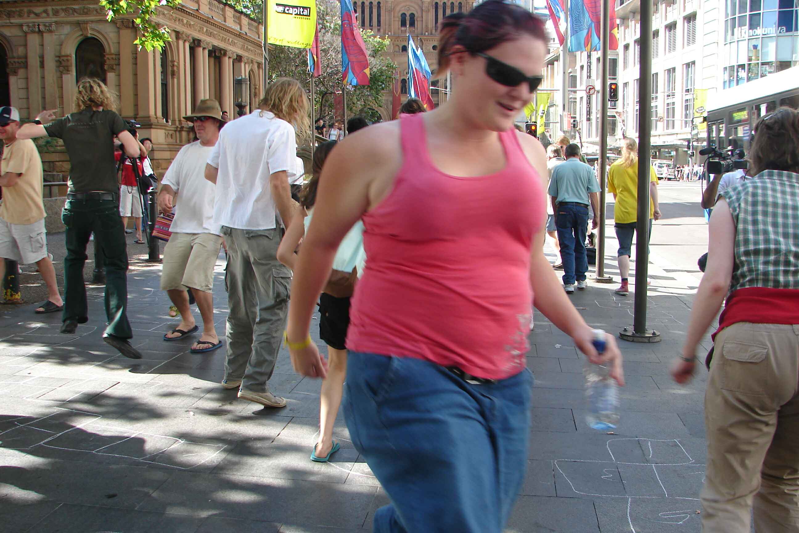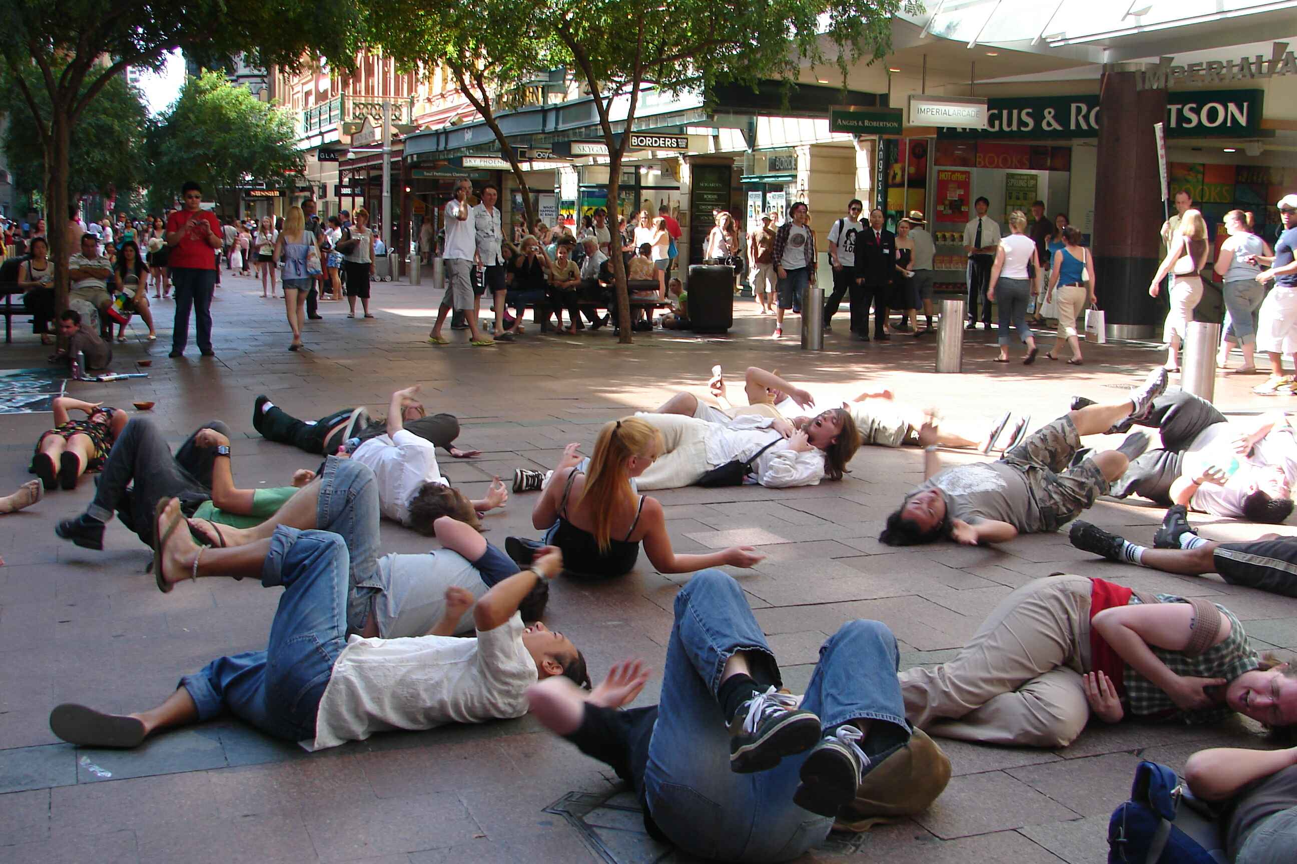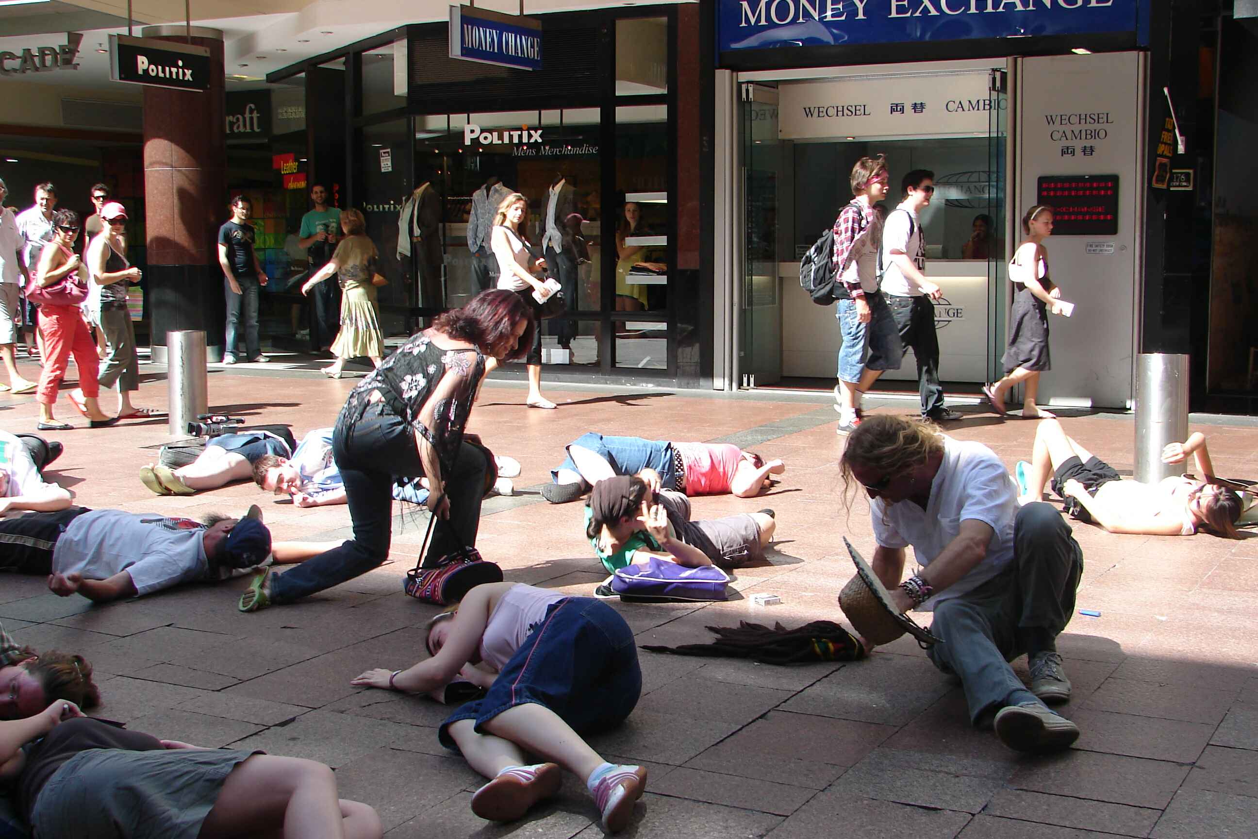The “Insects” was a mob re-visited, one that Mal dreamed up a couple of years ago. We liked it so much, we thought deserved another run. A short, sweet and quirky idea, that caused some observers minor alarm, as 50 mobbers started to cough and twitch, and fall to the ground. Alarm turned rather quickly to amusement and confuddlment. You have to love that in a flashmob! A security guard was over heard saying “Any idea what the %#@ that was?” His friend, stroking beard said.. ”I really don’t know. Maybe it was one of them flashmob things?”