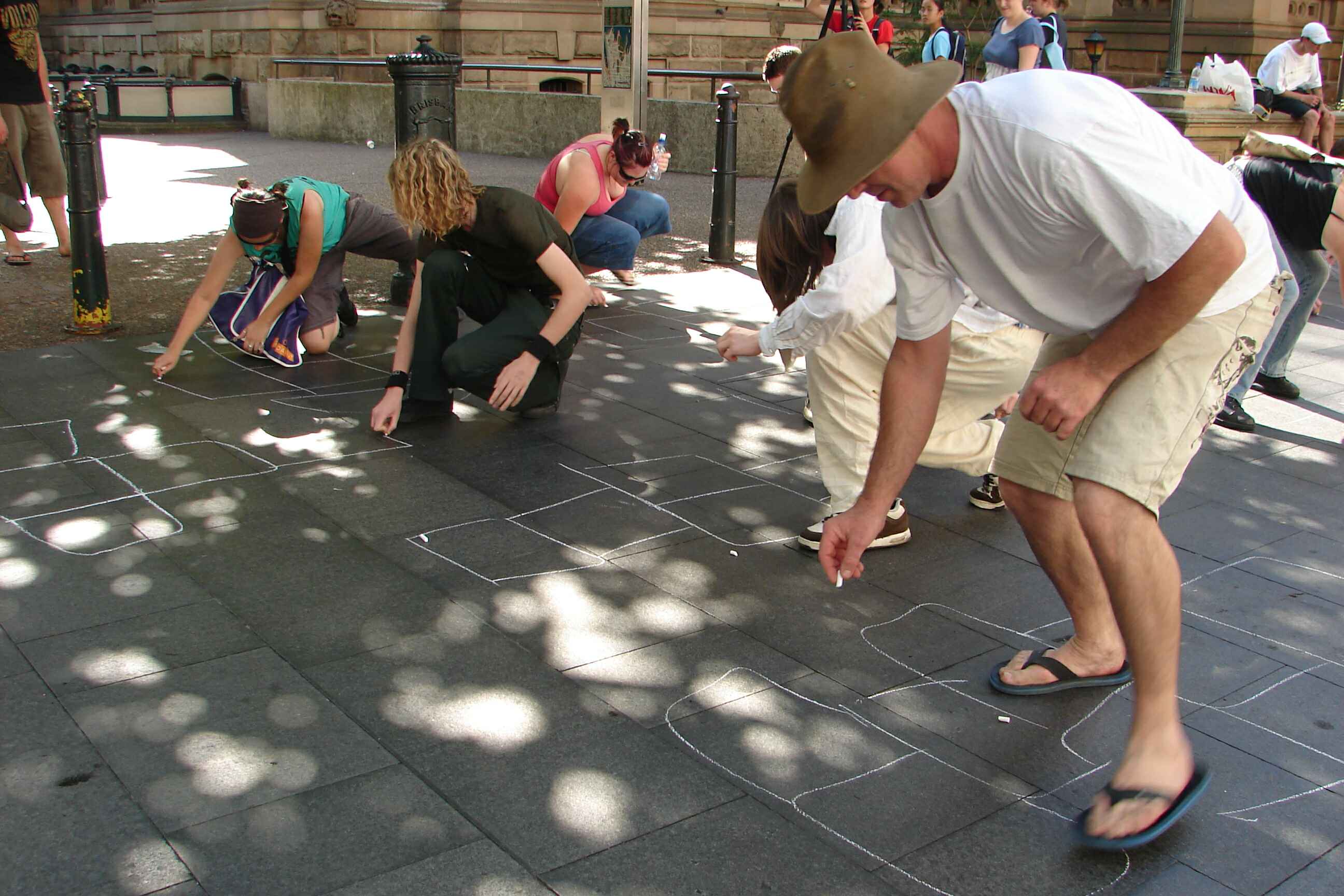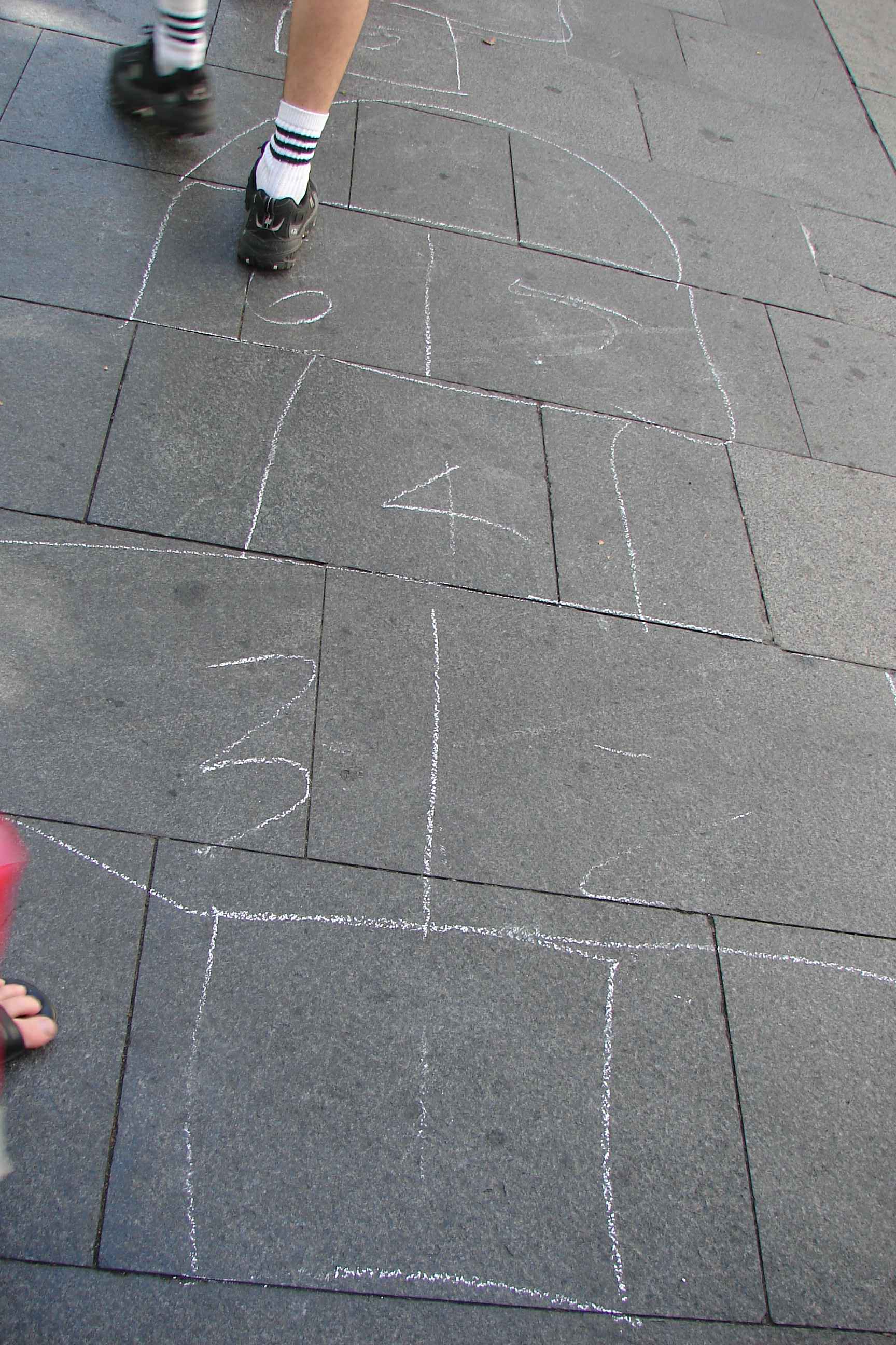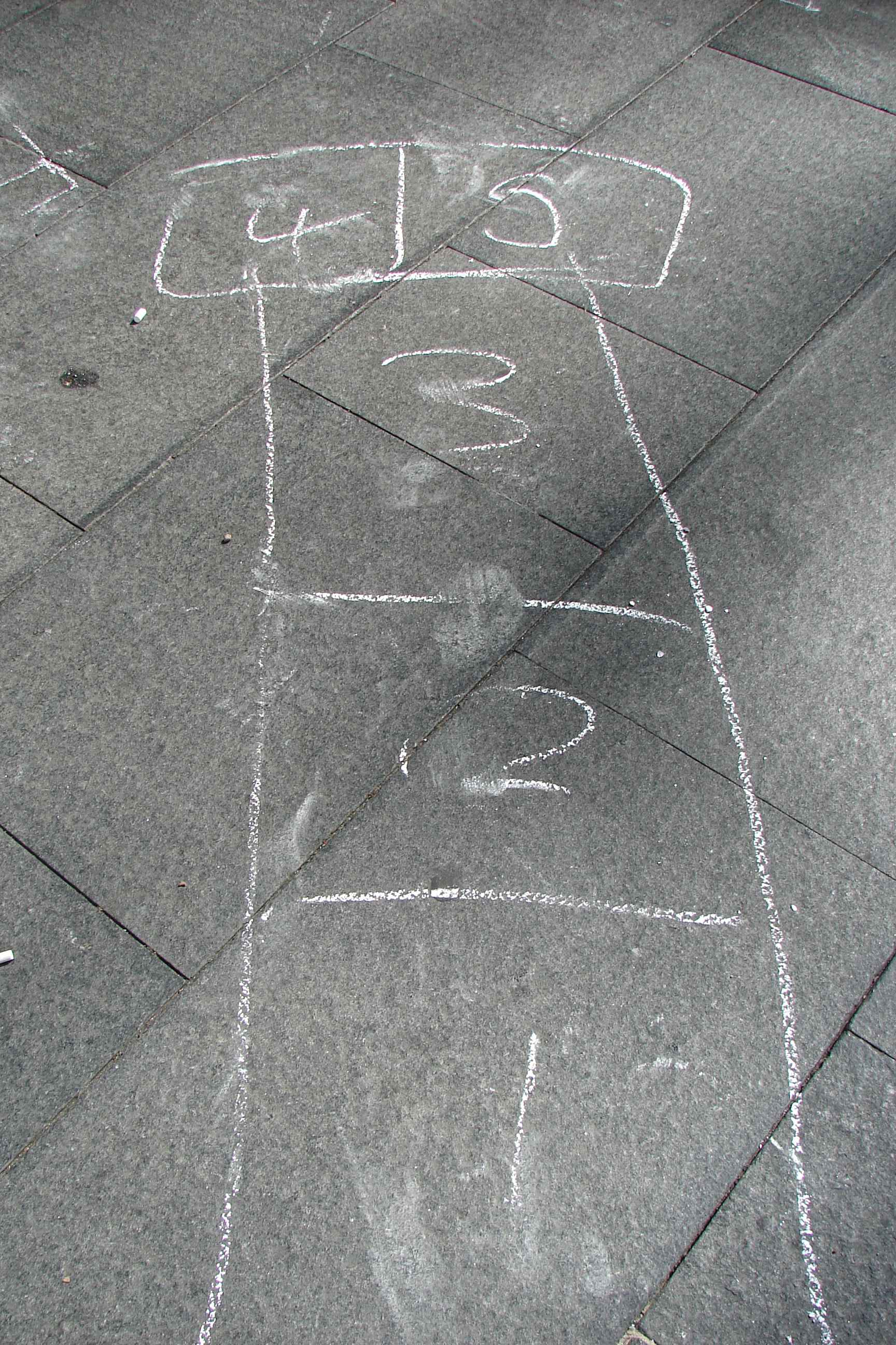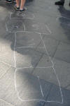 By 2:25pm you will have made your way to the Town Hall steps. The Mob rep, wearing the Rastafarian hat, will be in the vicinity. At 2:30pm the rep will move to the sidewalk. This is your cue to also move onto the sidewalk,, within their general vicinity. The rep will take off their hat. This is your cue to have your chalk ready. The rep will crouch down, and pull out their chalk, and begin to draw their hopscotch grid. Pick a spot close by, but with enough room for you to draw a grid too, and draw yours.
