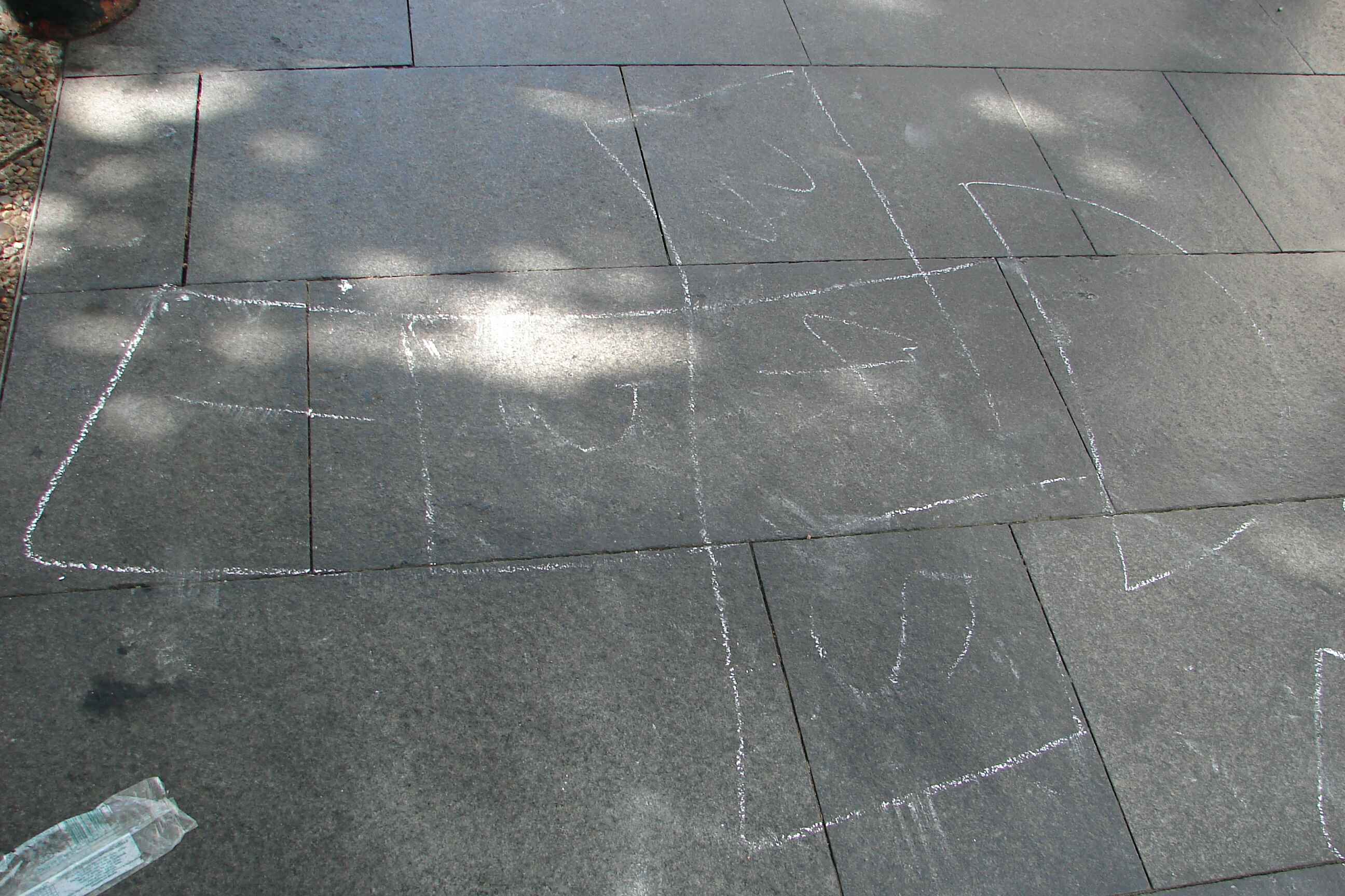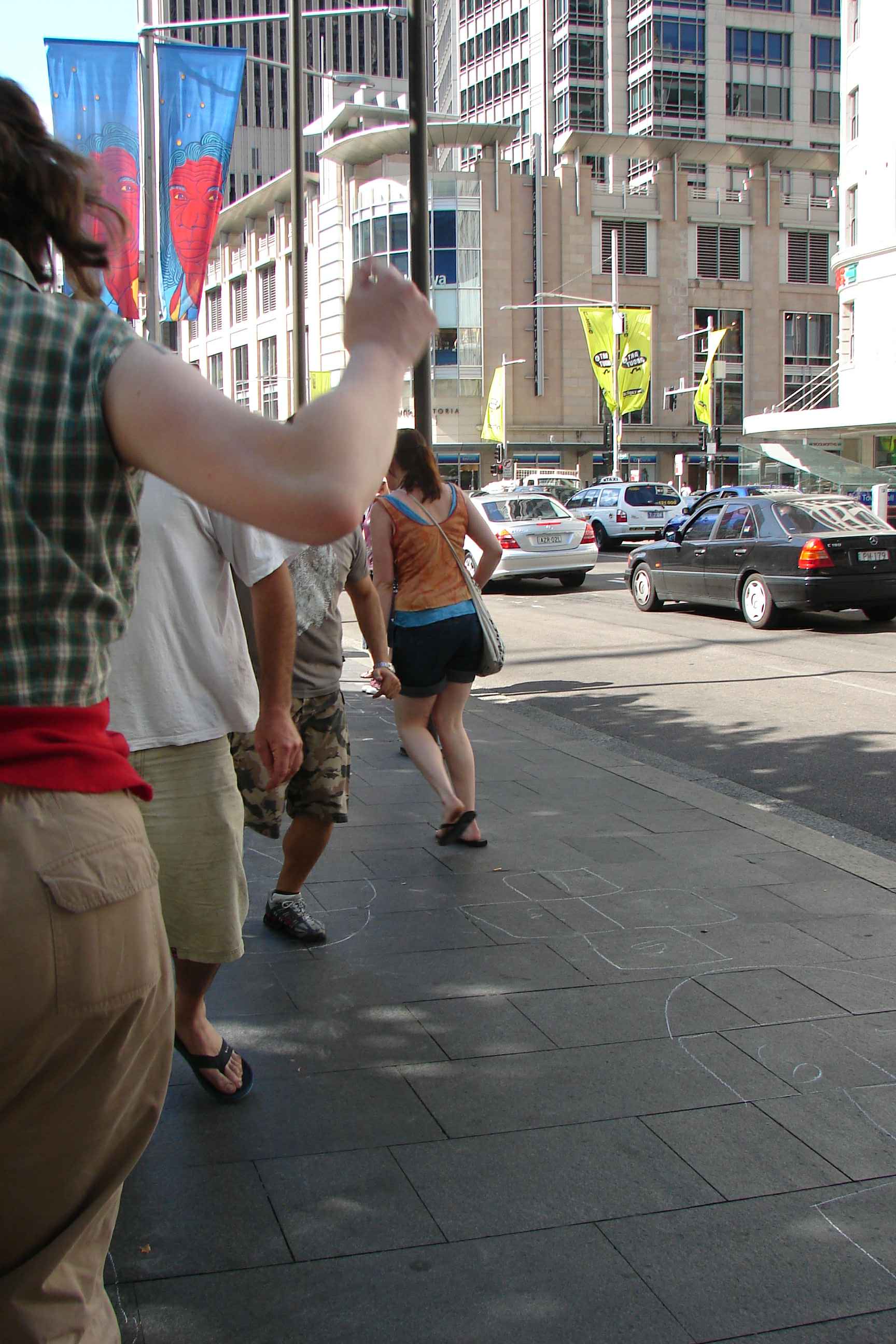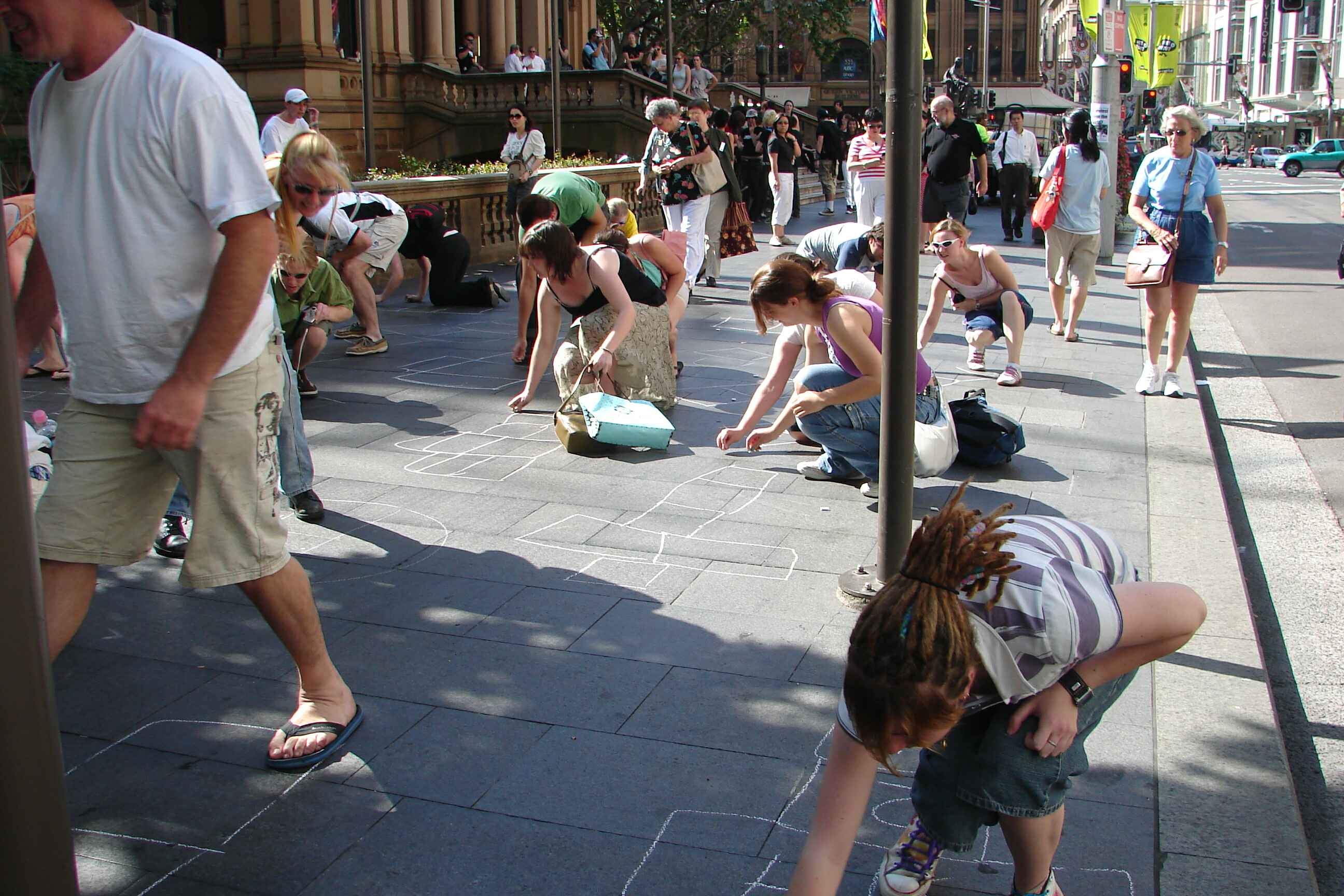 By 2:25pm you will have made your way to the Town Hall steps. The Mob rep, wearing the Rastafarian hat, will be in the vicinity. At 2:30pm the rep will move to the sidewalk. This is your cue to also move onto the sidewalk,, within their general vicinity. The rep will take off their hat. This is your cue to have your chalk ready. The rep will crouch down, and pull out their chalk, and begin to draw their hopscotch grid. Pick a spot close by, but with enough room for you to draw a grid too, and draw yours.