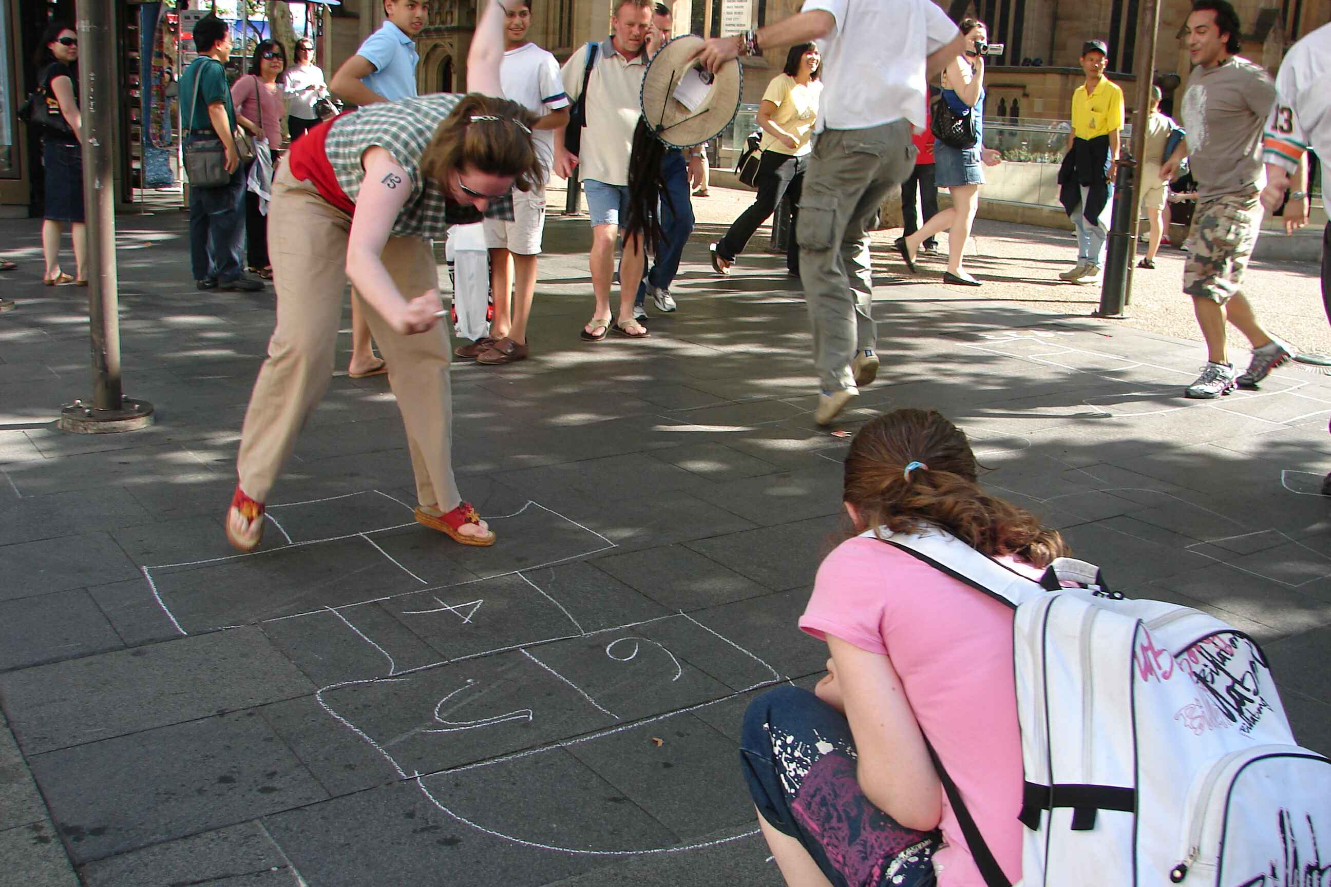 Once you have drawn your grid, begin hopping up and down upon it. Do that twice, then hop up to another person’s grid and jump up and down theirs. Leap from grid to grid making WHOOP! HOOP! sounds, as loud as you can. Continue hopping from grid to grid till you hear a whistle blow, This is you cue to begin join hands with fellow mobbers, and walk round in a circle singing, and swinging your arms.
