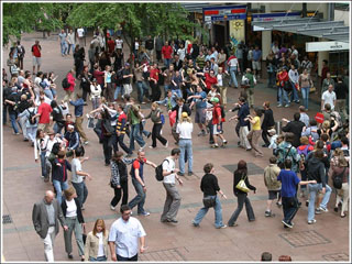 Also thanks to some fantastic photos of the event taken by Roger Barnes ( http://roger.mindsocket.com.au/pages/gallery/2003-09-20/index.html ) and some hardwork by Adriana, we can now present you with an WMV animation of the event, from converge to disperse, taken a few floors up looking down onto Pitt Street Mall. sydmob#3.WMV - 1.3MB