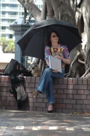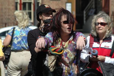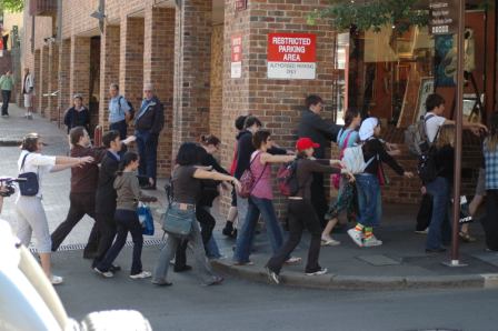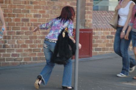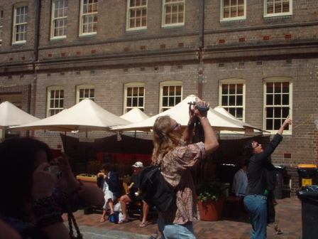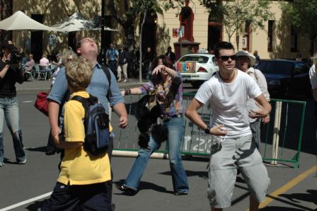 The footage that Octavia and company took shows a small child (and quite a few others) left standing, staring skyward for a fair while after we had all made a very effective disperse. As Tempest left the scene, weak, pale and shaken by such a disturbing event, she was assisted by Naomi, who asked loudly, “But what does it all mean?”. This very much added to the confusion of some of those non-mobbers, who were left contemplating vacant skies. A very loud American as heard to say "You deserve an academy award! I was looking for 15 minutes!"