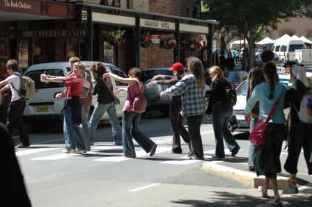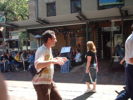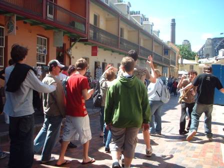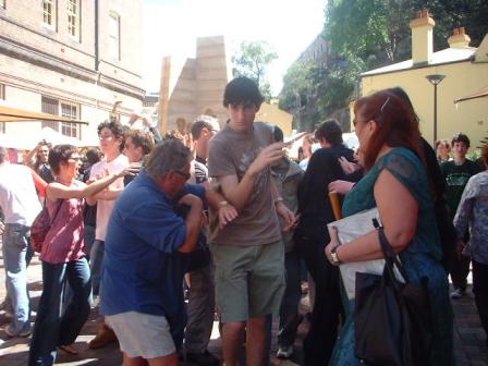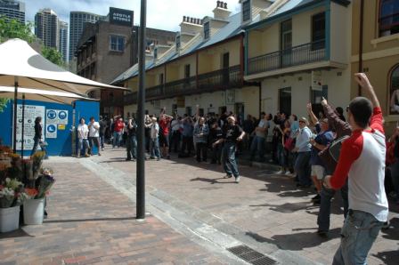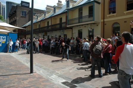 Toss a coin, if it is heads, make your way to Argyle & Playfair Sts (Lowenbrau Keller) and wait casually for your mob rep to appear. If it is tails, make your way to George St & Mill Lane (near Rocks Mkt), and loiter casually awaiting the arrival of your mob rep. The mob reps will be recognised by Rastafarian caps.