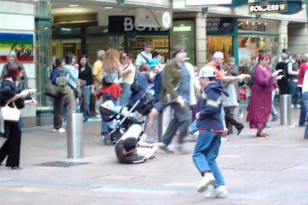 At 2:57 the mob reps will move towards the centre of the mall. Their Banana phone (which is on silent) will ring in their pocket. They will begin a loud