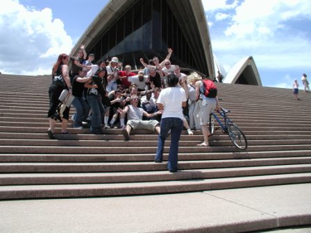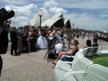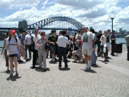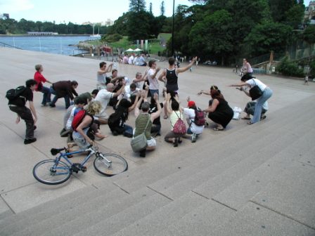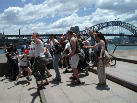 "On your mark" by drawing attention to themselves, talking about the view, whilst bumbling for a camera. They will ask a passer-by to take their photo. As the reps take their time, issuing instructions on how to use the camera and pose, jump into the photo, and bellow CHEEEEEEEEEEEESE! (A long drawn out eeee is required). Throw your arms out wide, and smile. Wait for a startled look, and hopefully a pic, then mock disperse. Head towards the Opera house. On a day like today there should be lots of easy targets.