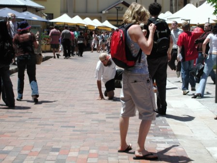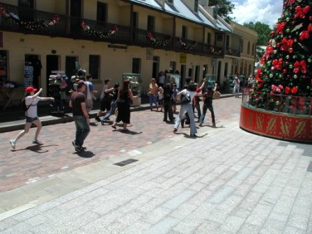 Anyhow, I digress. As it was Christmas, we figured the best way to signal the disperse was to find a Messiah. Or just a couple of very naughty boys! This we did. Two guys in perfect position to worship, standing right in the middle of the Opera house stairs. Mal filmed our mad devotion, and their hilarious reaction to this. I have to give them credit, they took on the role of Messiah willingly! Mal stayed there after we dispersed. He has captured the three victims checking out their photos after we left. This is cute to see, a kind of. There was rather a lot of that going on yesterday. People checking their cameras “Did that really happen!”