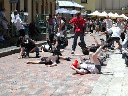 congregate at Argyle & Playfair Sts (Lowenbrau Keller), if you are an Indian, you will be at George St & Mill Lane (Near Rocks Mkt). At 1.46 the reps will step forward and jump onto their horses. Saddle up with them and begin your ware cries. Gallop about, drawing you bow and arrow or gun, and take shots at the enemy. Feel free to shoot the general public too. (it ain't a war unless you take shots at a General!) Die and